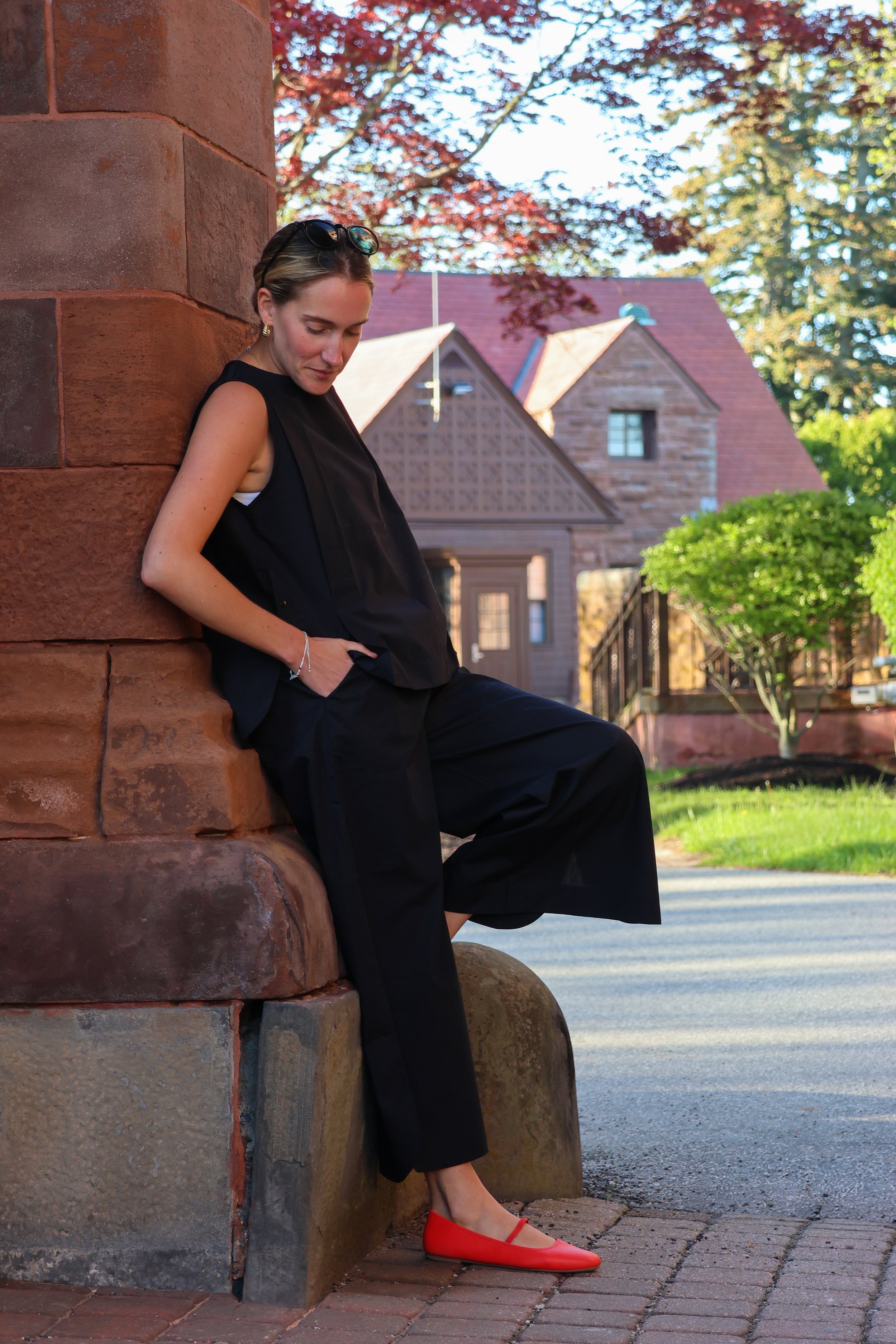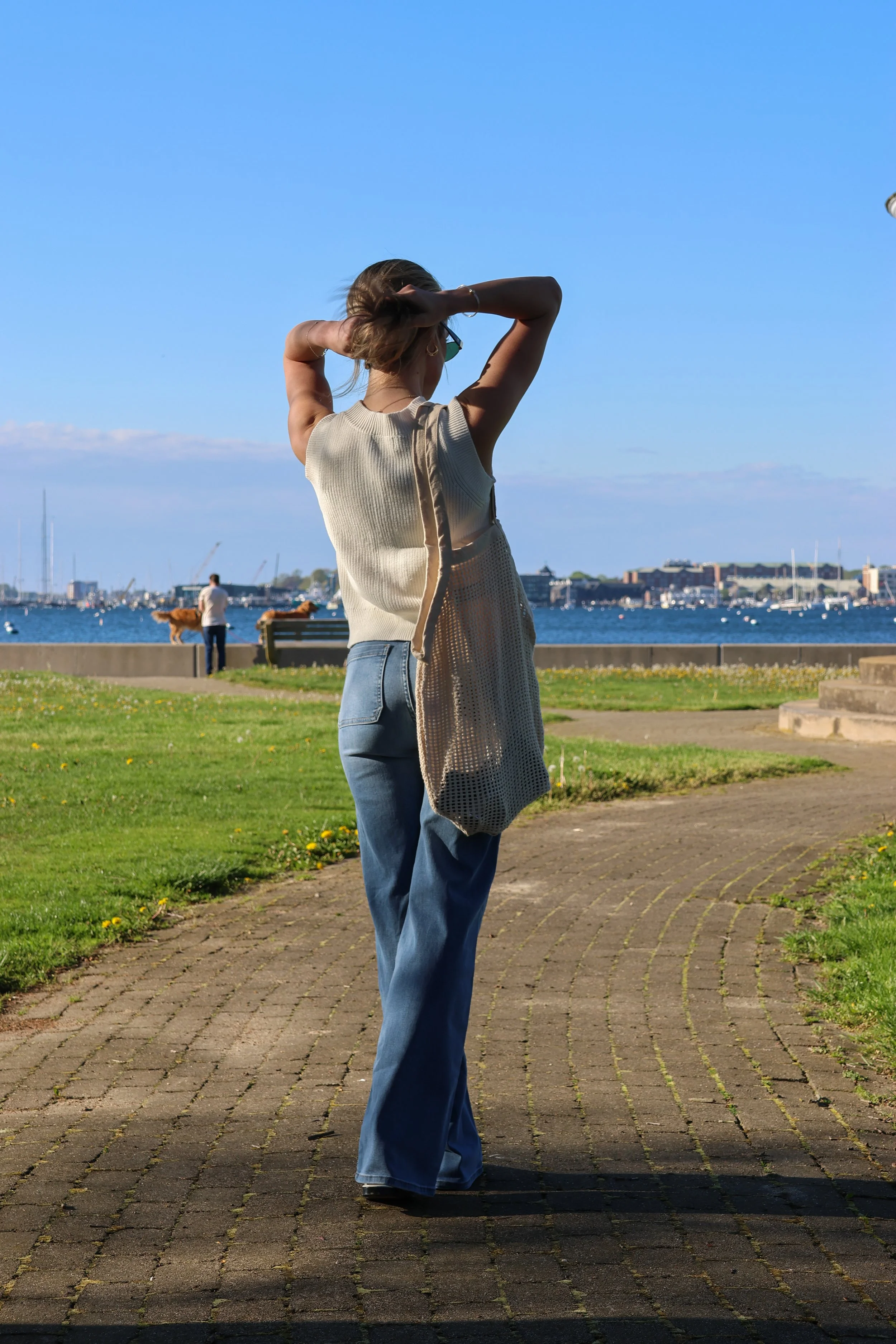 The light striped linen sits beautifully against the coastal backdrop, its horizontal styling balancing the garment’s natural vertical lines. It captures the essence of Holebrook’s spring collection—light, breathable, and effortlessly refined.