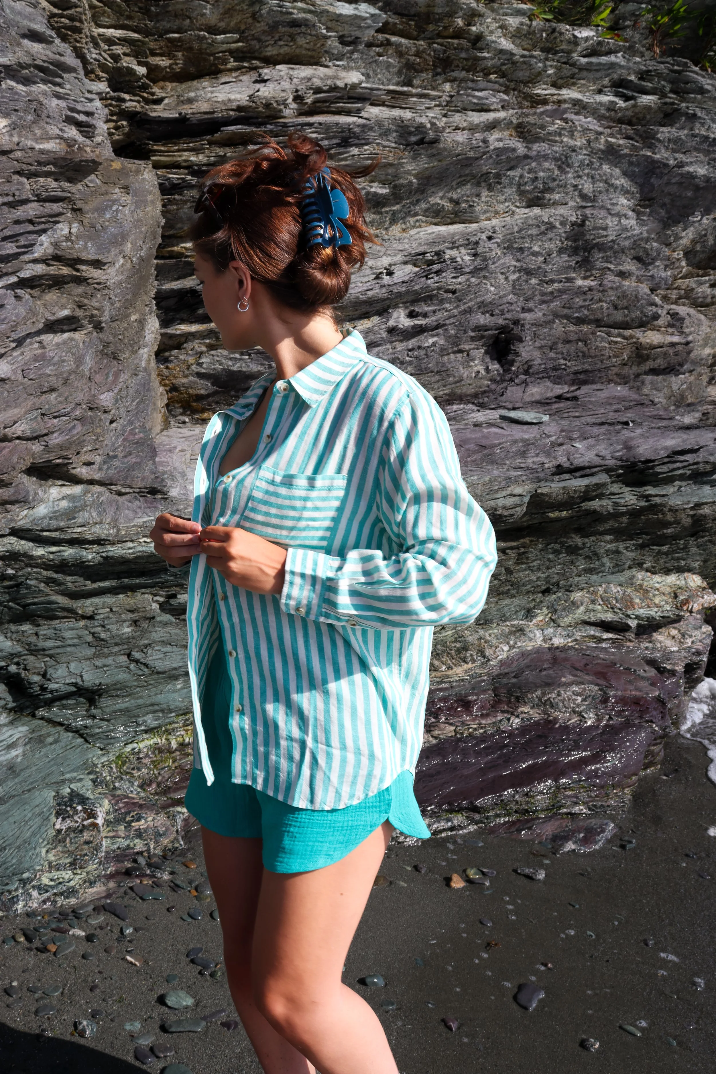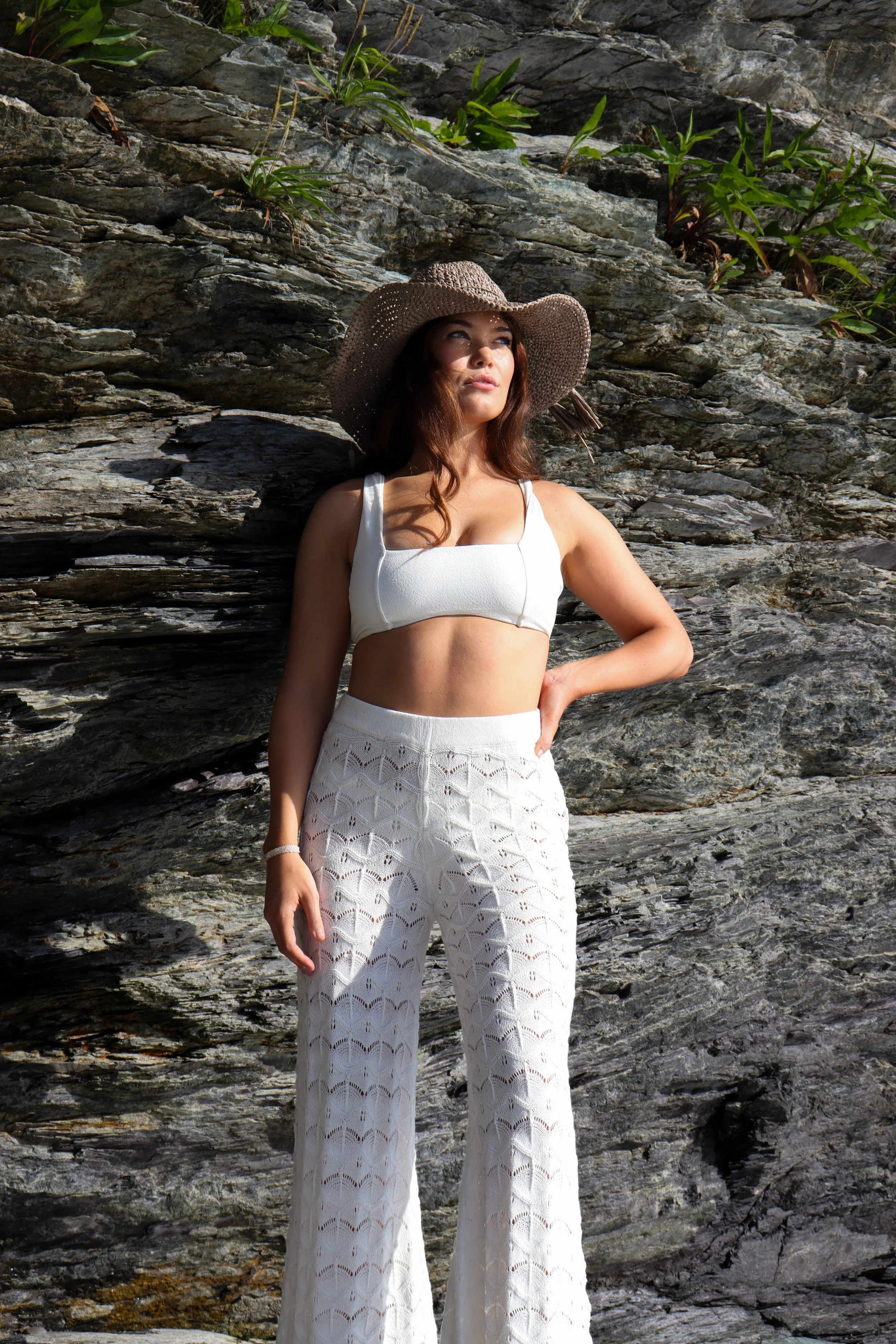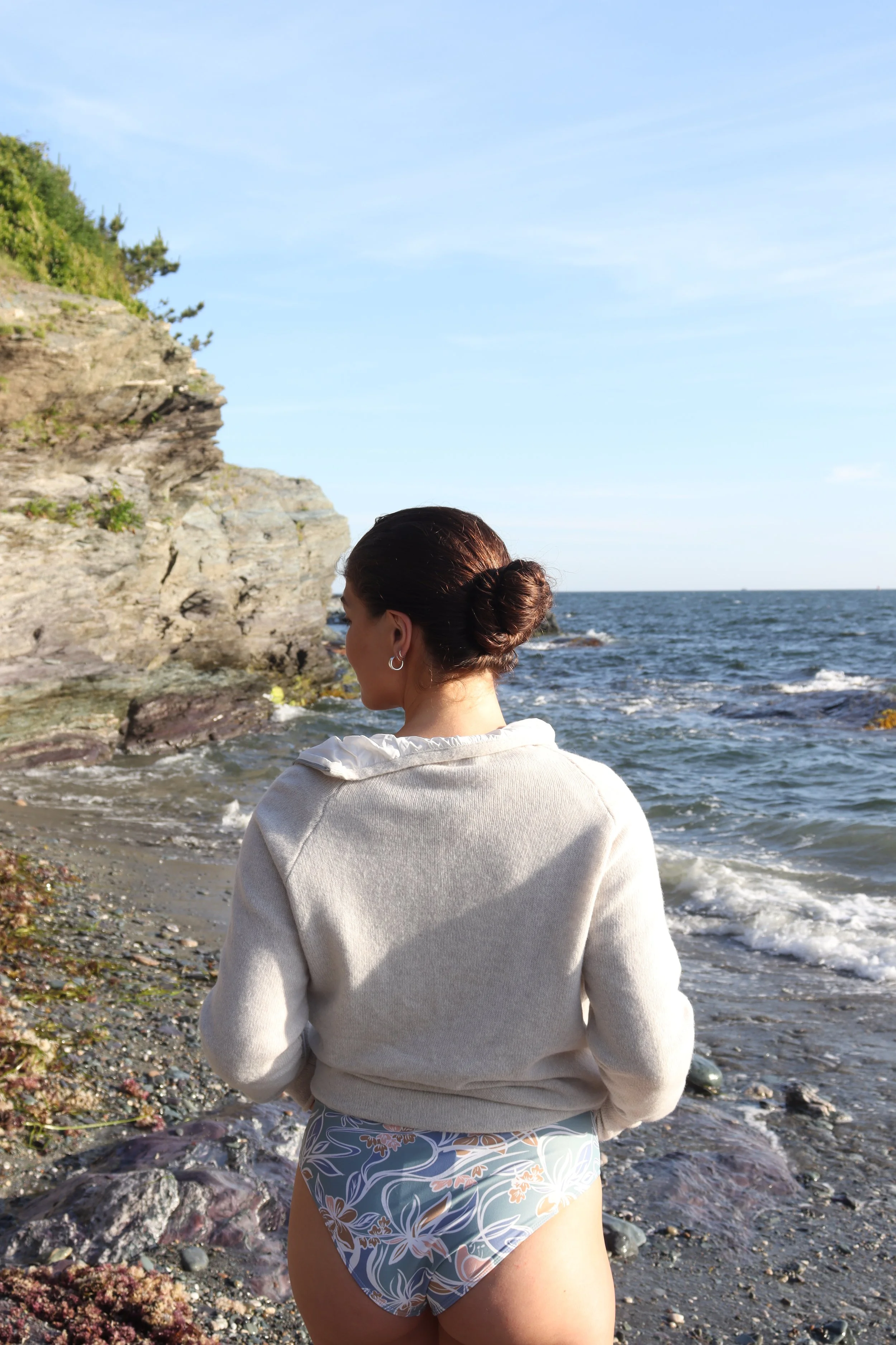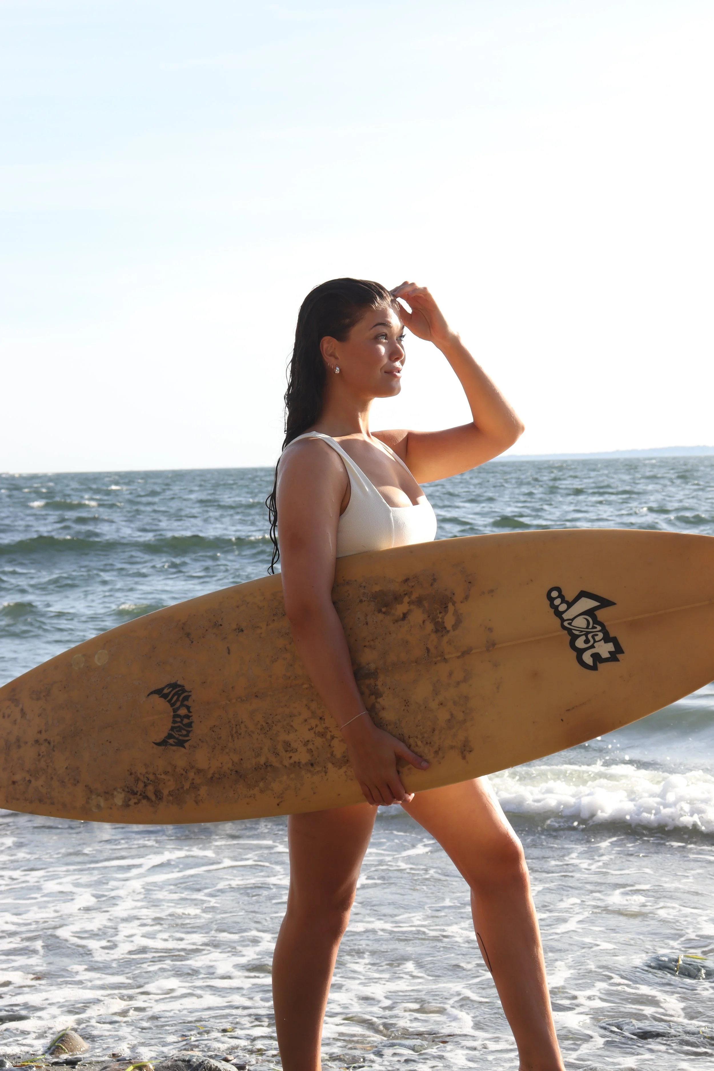 This swim campaign was built around letting the suits speak for themselves—bold, vibrant colors with textured fabrics and no patterns to distract from the silhouette. Shot in a rocky beach cove, the dark coastal backdrop was chosen to amplify the brightness of each piece and highlight the strength of the design. The collection is paired with a range of cover-ups, from light and breezy to thicker, post-surf layers, creating a lineup made for real coastal living: simple, functional, and made to stand out.